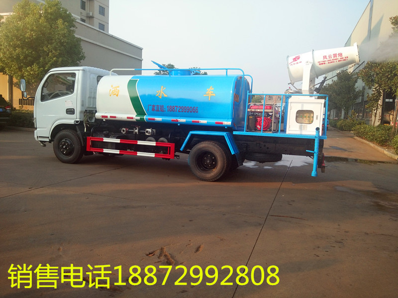 國六東風小多利卡帶霧炮5方灑水車采用 大功率水泵,灑水車前沖(噴)后灑,帶側噴,帶65消防接口,后平臺帶泡不帶門,前封頭帶水位計,后平臺主管路帶1寸澆花接口,后爬梯,配3米長抽水鋼絲塑料管兩根,用于抽水作業(yè)使用;罐后帶工作平臺,平臺上帶安全護欄,裝高位綠化灑水炮一個,灑水炮可全方位360度旋轉,可連續(xù)調(diào)成直沖狀、大雨、小雨、毛毛雨等不同噴灑方式,調(diào)成直沖狀射程長度≥28m、高度≥12m,調(diào)成細雨狀射程寬度≥15m;后工作平臺下用槽鋼連接焊有5mm厚保險杠,提高灑水車的主動安全性,泵可自吸自排,安裝過濾網(wǎng),帶消防接口,可通過消防栓進水,帶自流閥,隨車選裝20米綠化卷盤,可噴灑農(nóng)藥