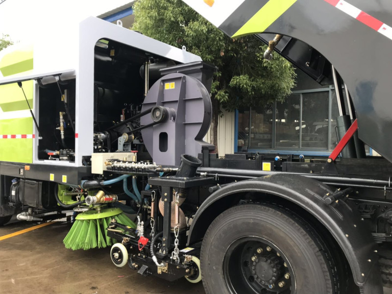 電指示燈熄滅,且無蜂鳴器響。啟動副發(fā)動機(jī)怠速運(yùn)轉(zhuǎn) 2-3 分鐘。 b.按左前、右前、后掃吸嘴順序降下前、后掃及吸嘴,然后檢查掃盤接地是否適當(dāng),吸嘴離 地間隙是否正常(5-10mm),如不適合,則進(jìn)行調(diào)整。 c.檢查三通球閥的手柄位置,選擇左掃球閥開閉狀態(tài),打開灑水系統(tǒng)總球閥,將水泵開關(guān)旋 至“工作”位置。 d.檢查各掃盤轉(zhuǎn)動是否正常、各噴水口是否有水噴出。 e.確信正常后,操作副發(fā)手油門,使其至 2000-2300r/min,按底盤車要求,駕駛掃路車用一 檔起步,清掃作業(yè)工作中,機(jī)手應(yīng)密切注意各種儀表,確信掃路車工作正常,并觀察清掃效