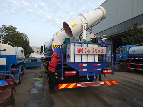 霧炮車,也叫抑塵車,工作效率約為普通灑水車的30倍。水箱中的水經(jīng)過霧化后,由高壓風(fēng)機噴出。相比普通灑水車噴出的水流,水霧顆粒極為細(xì)小,達(dá)到了微米級,其吸附力也增加了3倍,耗水量卻降低了70%,遭遇霧霾天氣、空氣質(zhì)量PM2.5嚴(yán)重超標(biāo)時,可隨意選定一個區(qū)域進(jìn)行液霧降塵、分解淡化空氣中的顆粒濃度、將飄浮在空氣中的污染顆粒物、塵埃等迅速逼降地面,達(dá)到清潔凈化空氣的效果。