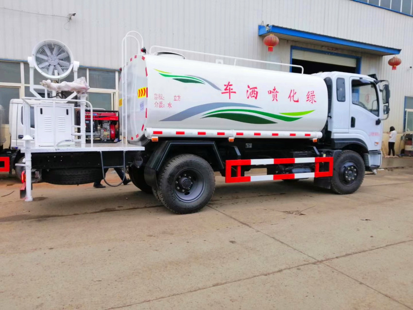 12噸灑水車(chē)上裝配置:整車(chē)具有前沖、后灑、側(cè)噴(更換噴頭后變?yōu)閭?cè)花灑)、后置式工作平臺(tái)(帶踏梯,四周有安全護(hù)欄)、平臺(tái)上設(shè)置有高壓水炮(可360°全方位旋轉(zhuǎn),水流可調(diào)成柱狀,射程28米;也可調(diào)成霧狀,射程14米,可連續(xù)噴射出:直沖狀、大雨、中雨、小雨、毛毛雨)。該車(chē)灑水寬度大于14米,配備優(yōu)質(zhì)大功率專(zhuān)用灑水泵、取力器、雜物過(guò)濾網(wǎng)、國(guó)標(biāo)通用65型消防接口(可通過(guò)消防栓加水)、1套自流球閥系統(tǒng)(可自吸自排,吸程6米)、2根引水鋼絲膠管(帶陰陽(yáng)快速接頭)、配鎖、水位計(jì)、高音作業(yè)喇叭,兩側(cè)及后加強(qiáng)型保險(xiǎn)杠,防滑爬梯,膠管儲(chǔ)存筒。