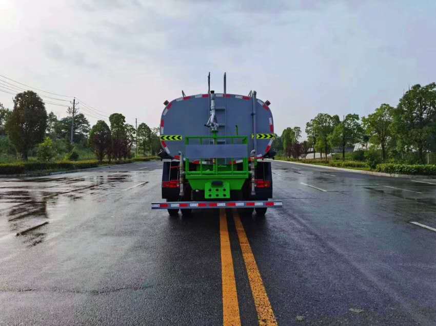 4.灑水車前噴頭位置較低,靠近地面,噴灑壓力較大,可用于沖洗路面;后噴頭位置較高(灑水車后噴頭一般左右各安裝一個(gè)),灑水面較寬,可用于公路施工灑水,使用后噴頭時(shí),應(yīng)將前噴管關(guān)閉;使用可調(diào)噴頭灑水時(shí),灑水寬度可根據(jù)需要調(diào)整。灑水寬度越寬,中間重疊量越少,灑水密度越均勻。