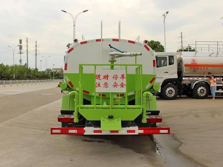 具有前沖、后灑、側(cè)噴(更換噴頭后變?yōu)閭?cè)花灑)、后置式工作平臺(tái)(帶踏梯,四周有安全護(hù)欄)、平臺(tái)上設(shè)置有高壓水炮(可360°旋轉(zhuǎn),可調(diào)成柱狀,射程28米;也可調(diào)成霧狀,射程14米,可連續(xù)調(diào)成:直沖狀、大雨 、中雨、小雨、毛毛雨),整車灑水寬度大于14米。配備大功率灑水泵,取力器,雜物過濾網(wǎng),通用65型消防接口(可通過消防栓加水)、1套自流球閥系統(tǒng)(可自吸自排,垂直吸程6.5米),2根引水鋼絲膠管(帶陰陽(yáng)快速接頭),配鎖,水位計(jì),作業(yè)高音喇叭。兩側(cè)及后加強(qiáng)型保險(xiǎn)杠,防滑爬梯,膠管儲(chǔ)存筒。