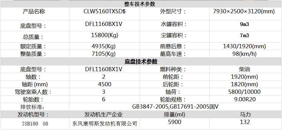 | 車型號(hào) | CLW5160TXSD5 | 底盤型號(hào) | DFL1160BX1V |