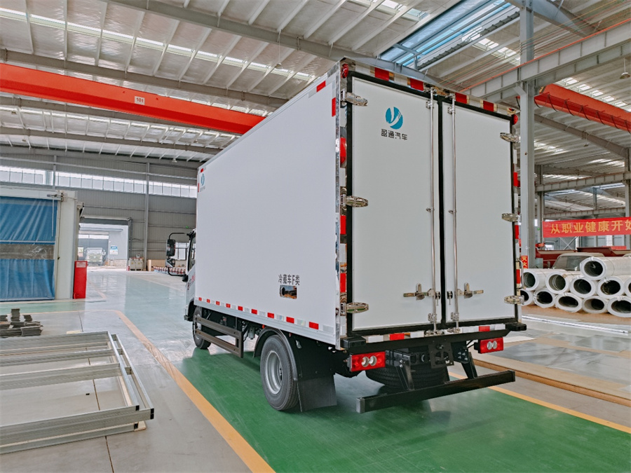 廂體采用內(nèi)外玻璃鋼材料制作,中間夾層為高密度保溫材料,用真空復(fù)合一次成型,表面光潔平整,強(qiáng)度高,使用壽命長(zhǎng),廂體邊緣采用優(yōu)質(zhì)鋁合金包邊和專(zhuān)用密封膠處理,具有重量輕、保溫、密封效果好等特點(diǎn)。門(mén)框鎖件為不銹鋼材質(zhì),門(mén)四周用一次成型密封條密封,廂體外形平整美觀,車(chē)廂頂部加以雨檐,避免下雨天雨水對(duì)車(chē)廂的浸泡,延長(zhǎng)廂體使用壽命,車(chē)廂內(nèi)配有人性化照明系統(tǒng)。穩(wěn)固性和氣密性是普通冷藏車(chē)廂體不可比的,并且具有質(zhì)量輕,抗沖擊力強(qiáng),無(wú)滲透等優(yōu)點(diǎn)。配備國(guó)產(chǎn)580制冷機(jī)組。