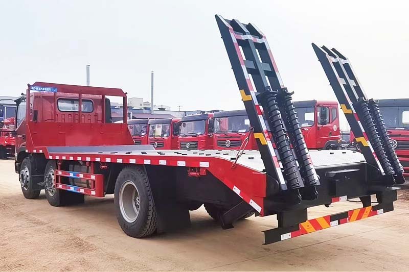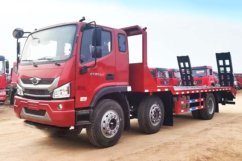 福田前四后四平板拖車,國六排放標準,采用新款瑞沃ES5駕駛室,標配中控鎖電動門窗、原廠空調、氣囊座椅、定速巡航、ABS等,可定制液壓雙節(jié)折疊爬梯,爬梯長度4米以上,運輸叉車等機械設備