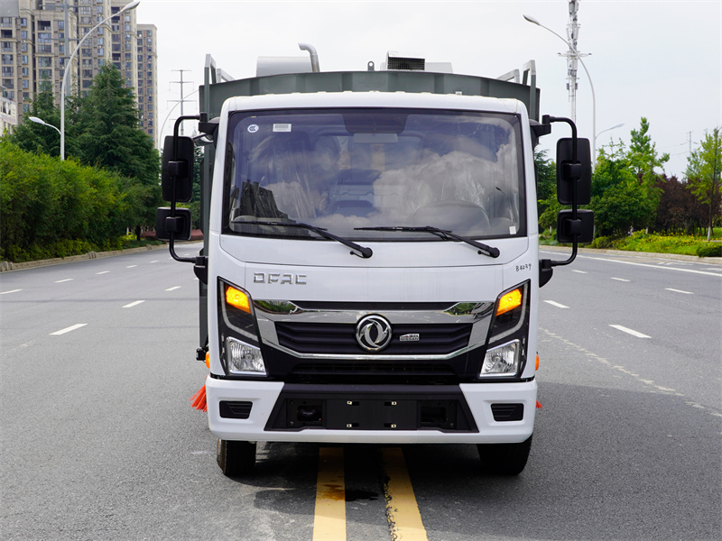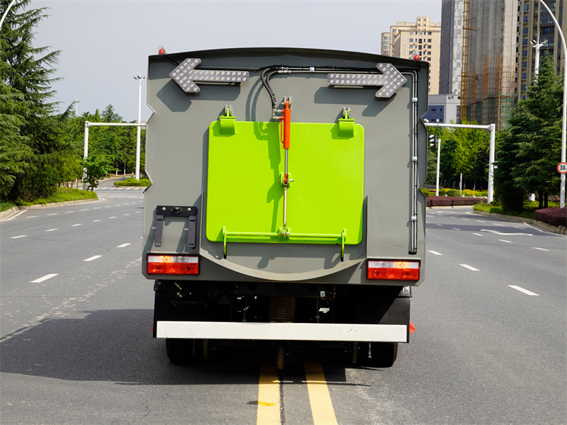 上裝標配:帶4個掃盤、江鈴87馬力副發(fā)動機、三洋馬達、施耐德控制開關、海普瑞斯電磁閥組、無級變速自動離合器、免維護離心式自動風機、尾部LED箭頭指示燈、手動泵應急系統、上海新西山電子水泵,垃圾舉升自卸功能