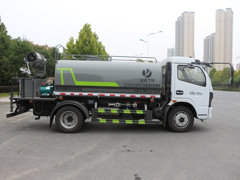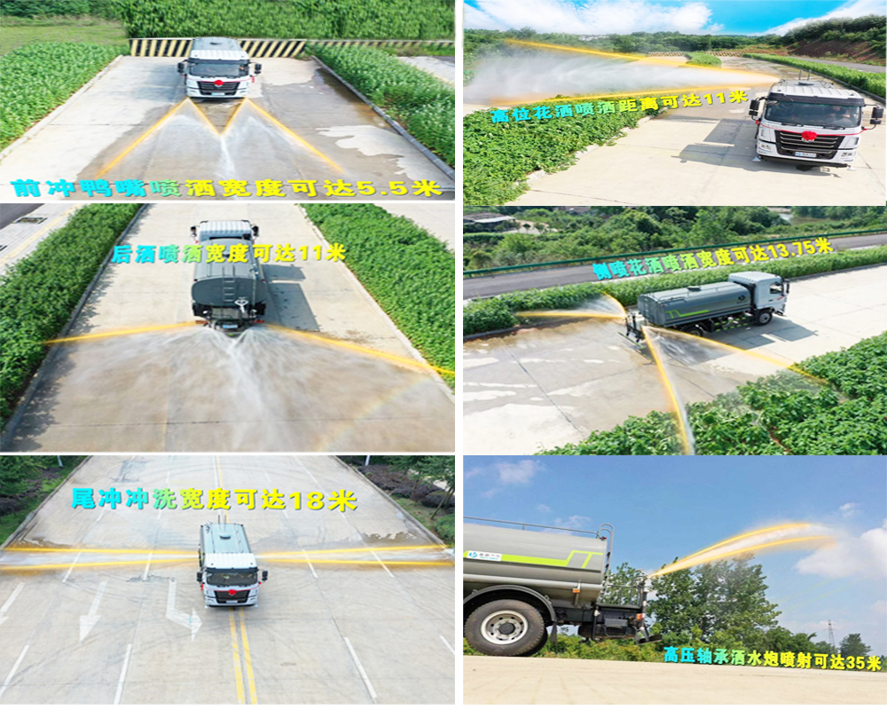 灑水車專用功能配置罐體實際容積約為8立方米,(罐體有效參數(shù)6.81立方米、額定載質量6805kg、)采用武鋼優(yōu)質碳鋼板卷壓成型。配備專用灑水泵,自吸自排,前噴后灑、側噴、后工作平臺及灑水高壓炮。灑水泵自吸高度為6米左右,整車灑水寬度14米左右,后工作平臺水炮可調成:直沖狀、大雨、中雨、小雨、毛毛雨,有效射程≥28米,整車帶接頭、水位計,自流閥。后工作平臺主管路帶1寸澆花接口,附送2根3米水管,1個爬梯,兩側及后保險杠。 |