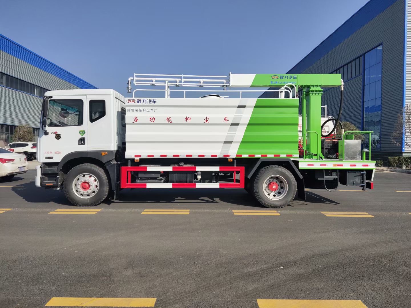 多功能抑塵車主要結(jié)構是在行走機構上加裝方型大容積水罐、高效遠程霧炮系統(tǒng)、大功率專用自吸自排水泵,中低壓沖洗灑水系統(tǒng)、綠化灑水高炮(可選裝自動灑水高炮,在罐體前端)等等而改裝組成。、罐體容積大(14立方),免征產(chǎn)品