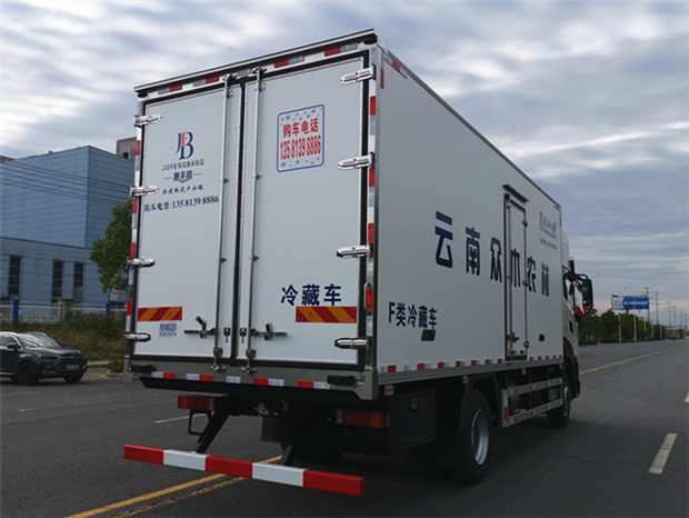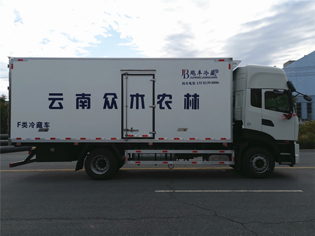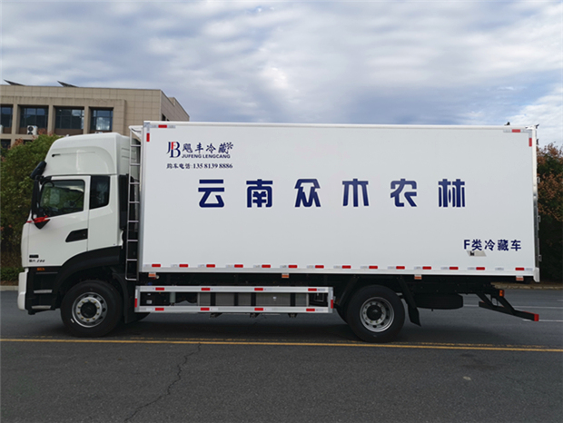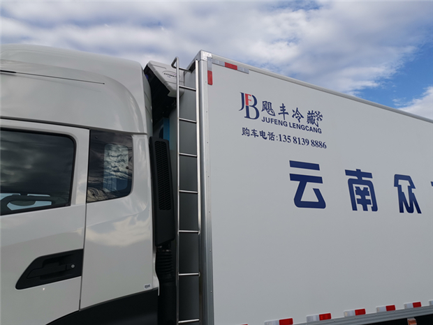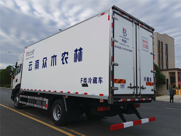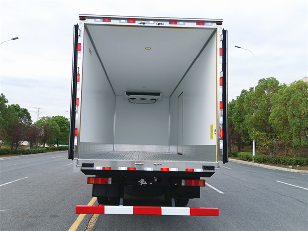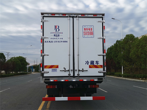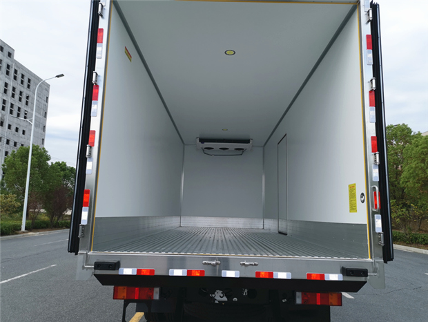 車廂配置為:《斷橋隔溫工藝、整體結(jié)構(gòu)框架》;內(nèi)外面料為3mm新款玻璃鋼;側(cè)板+頂板:全密封雙組合聚氨酯膠粘連;廂體厚度為8cm;頂板10cm厚,底板12cm厚,最新款鋁合金包邊型材;型材局部厚度為4mm(鋼制鉚釘加固);廂體內(nèi)部采用2個LED照明燈及廂體示寬燈;后門框為3mm厚不銹鋼材質(zhì);門框密封條為三元乙丙橡膠材質(zhì);加厚型不銹鋼合頁及鎖件;副梁為Q700車用大梁鋼;15mm厚大梁墊皮;加裝防撞膠塊;不銹鋼門鎖件,配后雙開門。底板為加厚鋁合金通風(fēng)槽滿焊,帶30cm高新型圍裙,副駕駛一側(cè)居中靠前開單側(cè)門,鋁合金側(cè)防護,不銹鋼冷機維護爬梯,帶大工具箱一個。帶剎車淋水器,前后淋水分別控制。