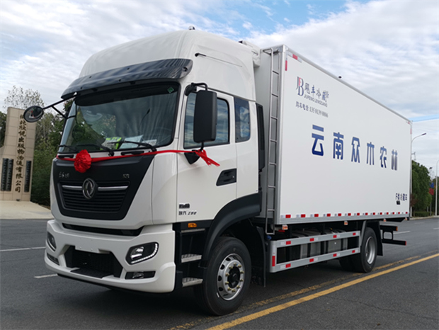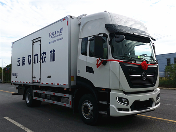 東風(fēng)天錦6米8冷藏車-國六290馬力,整車型號為:DFH5180XLCEX7,發(fā)動機型號為:D6.7NS6B290,整車外形尺寸:9200×2600×3960mm,箱體尺寸6800×2440×2450mm,總質(zhì)量:18000Kg,整備質(zhì)量:7880Kg,額定質(zhì)量為:9990Kg.